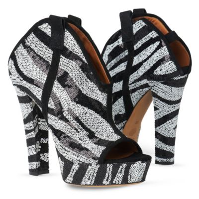 Shoe features synthetic leather, black and white sequenced upper, peep toe, cut out at heel, 4.5" heel, and 1.25" platform. Retailed at $633 now $448 and available for purchase at Selfridges & Co.